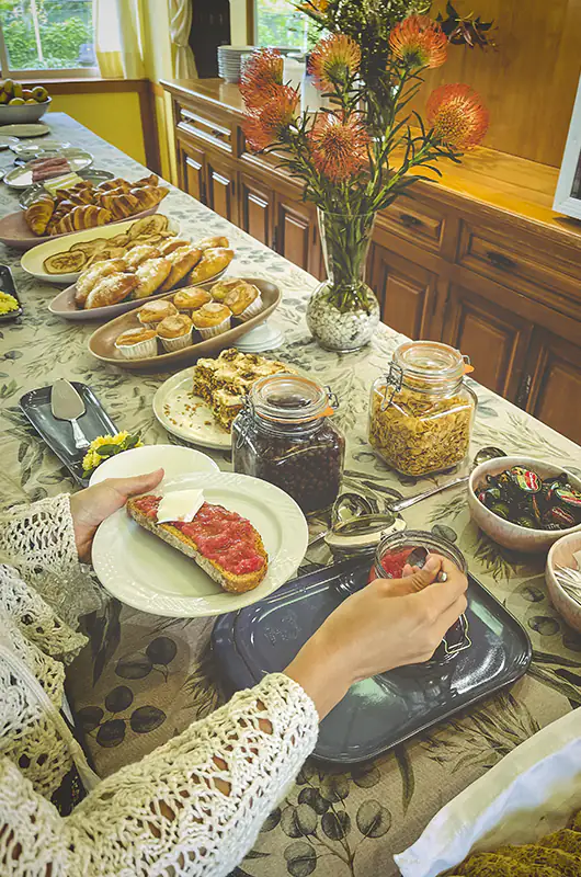 Disponemos de un amplio y luminoso comedor, rodeado de vegetación y frescura, donde le ofrecemos un reparador desayuno con productos de la tierra adaptados a todos los gustos.